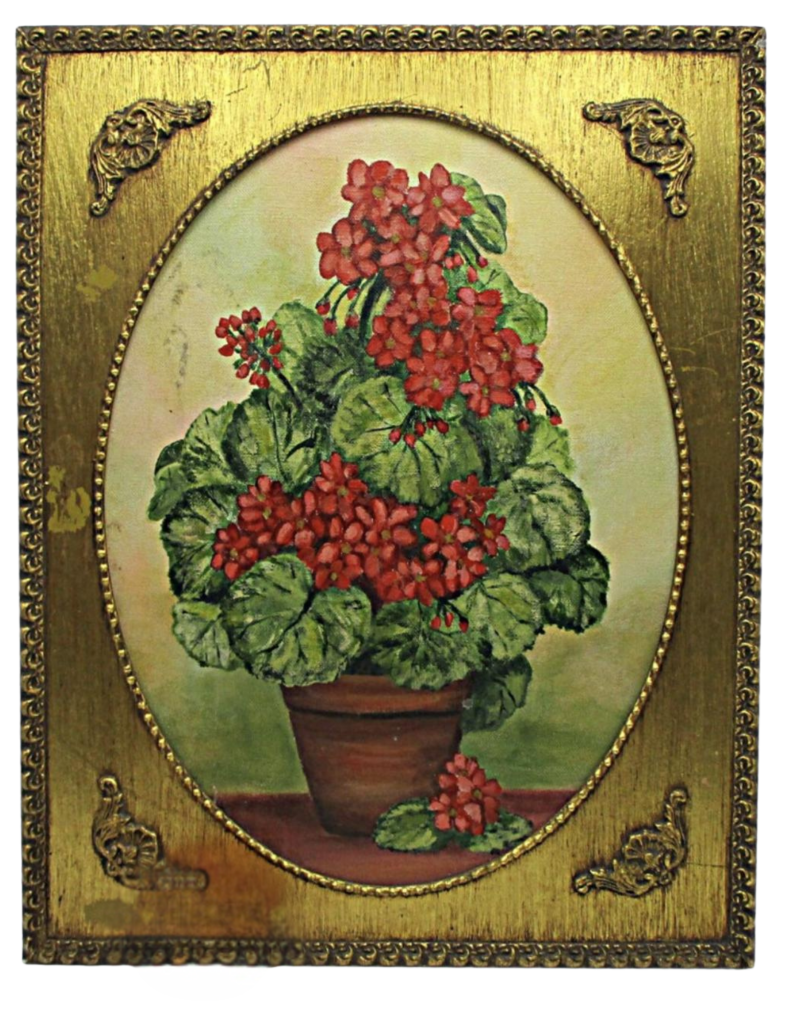 Modern rooms can feel stark, but an original oil painting introduces soul and softness. A still life of bright red geraniums in a gold antique frame adds vibrant color and texture — plus the irreplaceable charm of hand-painted detail.